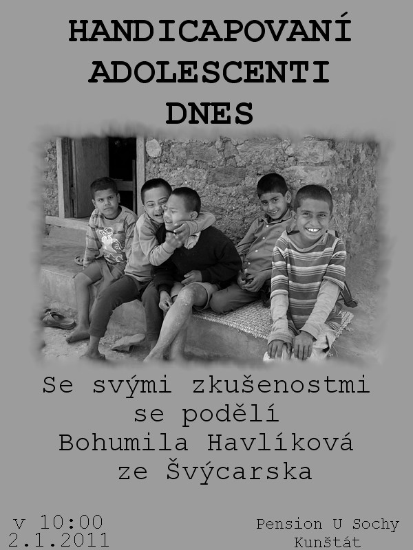 Přednáška ͈ Handicapovaní adolescenti dnes ̎ konající se 2. ledna 2011 v Penzionu U Sochy předčila mé očekávání. O své zkušenosti z praxe ve Švýcarsku se s námi podělila paní Bohumila Havlíková. Odborník a úžasná žena, která se otevřeně bavila o tématech, jež jsou v České republice bohužel stále tabuizované.  Je opravdu nutné a důležité vědět, že lze k adolescentům s postižením přistupovat zcela normálně, jako k intaktní populaci.